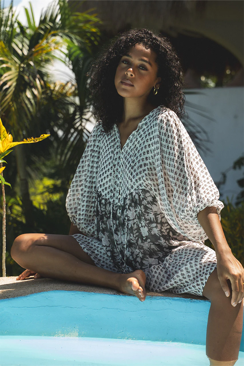 Celebrating our slow fashion ethos, Nora is an ode to the art of handmade. Beginning with four wood blocks intricately hand-carved to create two traditional floral designs, skilled artisans then use the blocks to slowly and carefully hand print delicate noir hues with a cacao outline upon the softest cotton voile. Tiers of printed fabric have then been gracefully layered and finished with mother-of-pearl buttons from bodice to base, forming this free flowing feminine style lovingly hand-crafted by a small group of women in Jaipur, India.