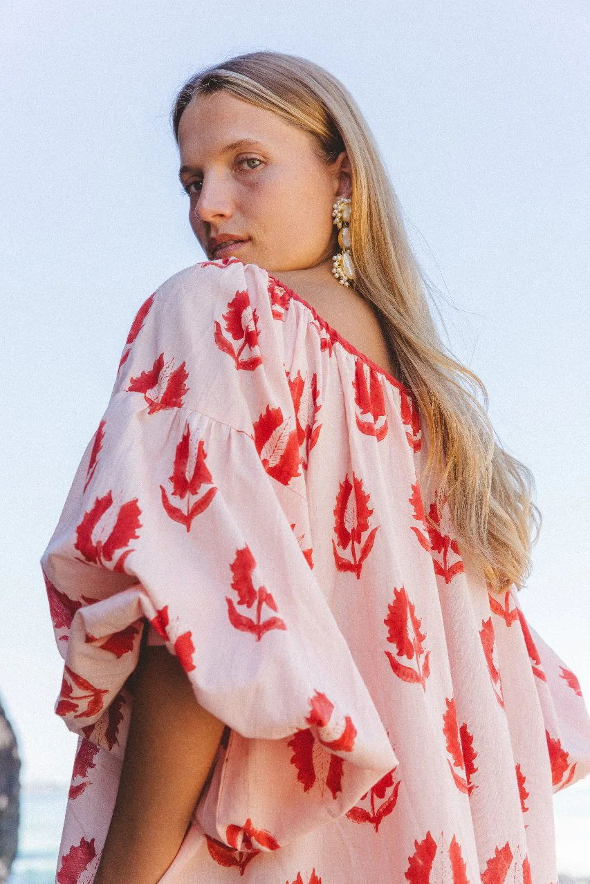 The Ria Mini Dress has been ethically handcrafted with 100% cotton into the most comfortably soft, billowing silhouette. Featuring an adjustable gathering at the neckline with a tie, pockets, and cuffs to finish the delightfully large sleeves. Adorned with hand printed florals, the making of this dress serves to support the preservation of hand craftsmanship and women empowerment in India.